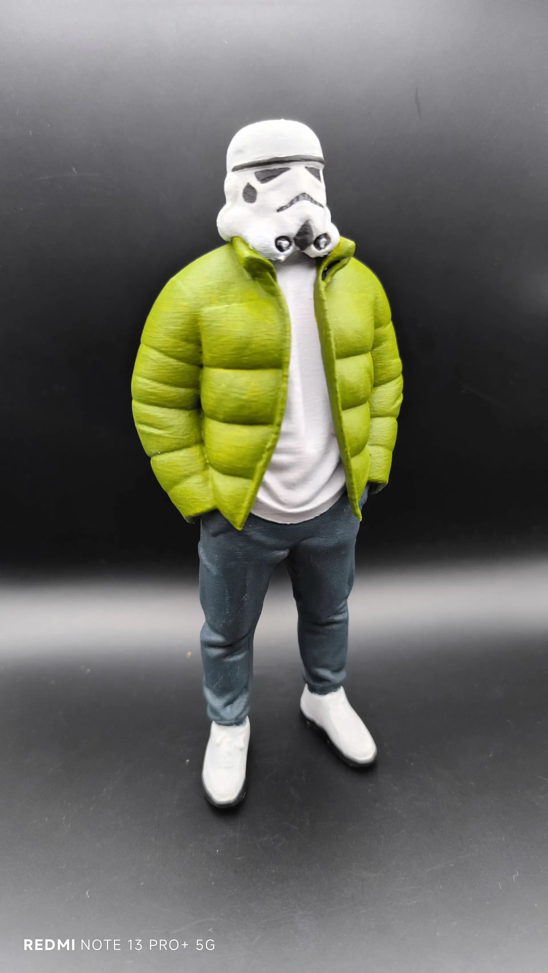 A fresh take on a galactic classic — this piece features a Stormtrooper reimagined in everyday streetwear. Dressed in a puffer jacket, beige joggers, and black sneakers, the traditional enforcer of the Empire trades in blasters for laid-back cool. It’s a fun fusion of Star Wars and urban style, perfect for fans who appreciate character with attitude.
