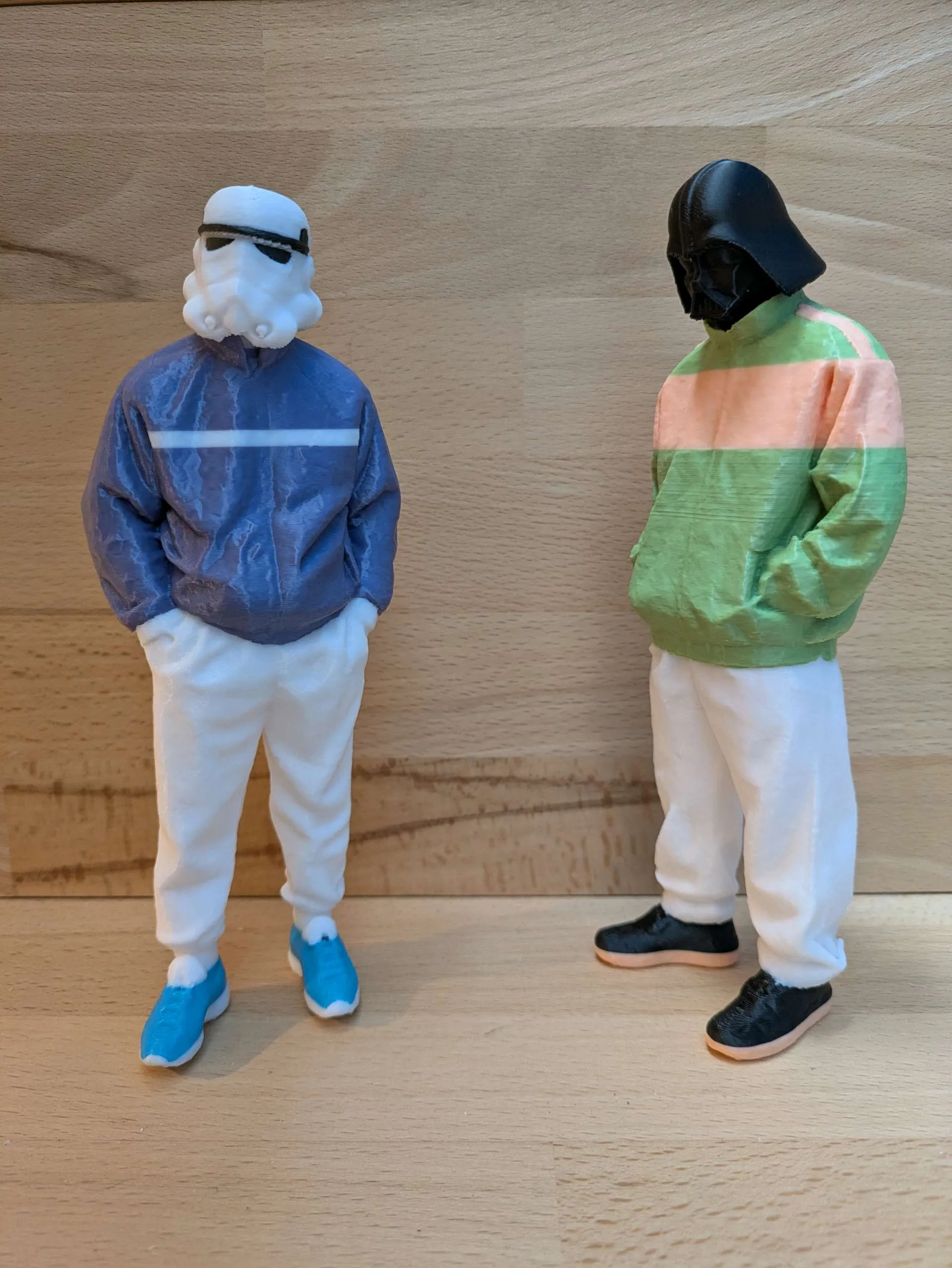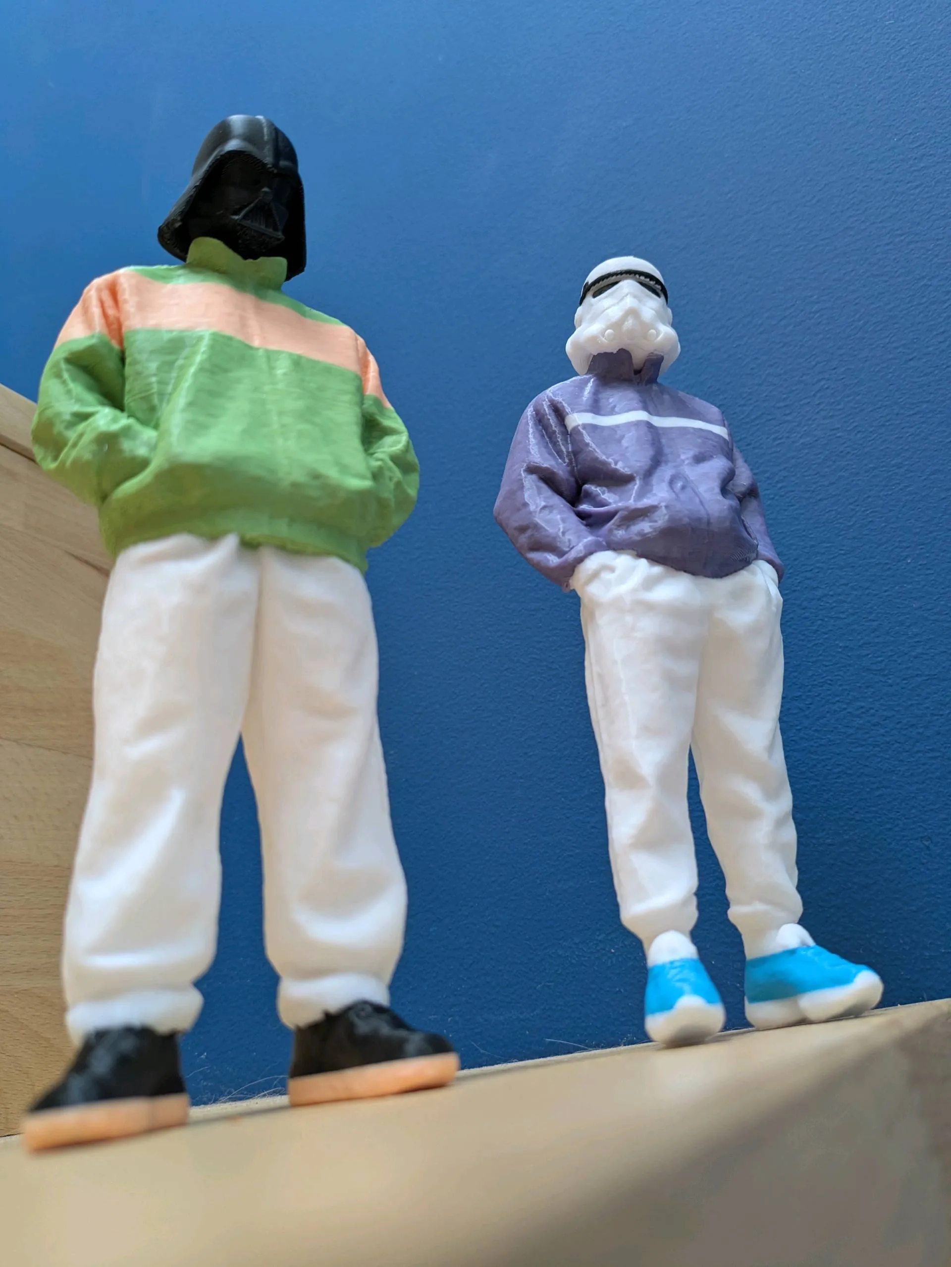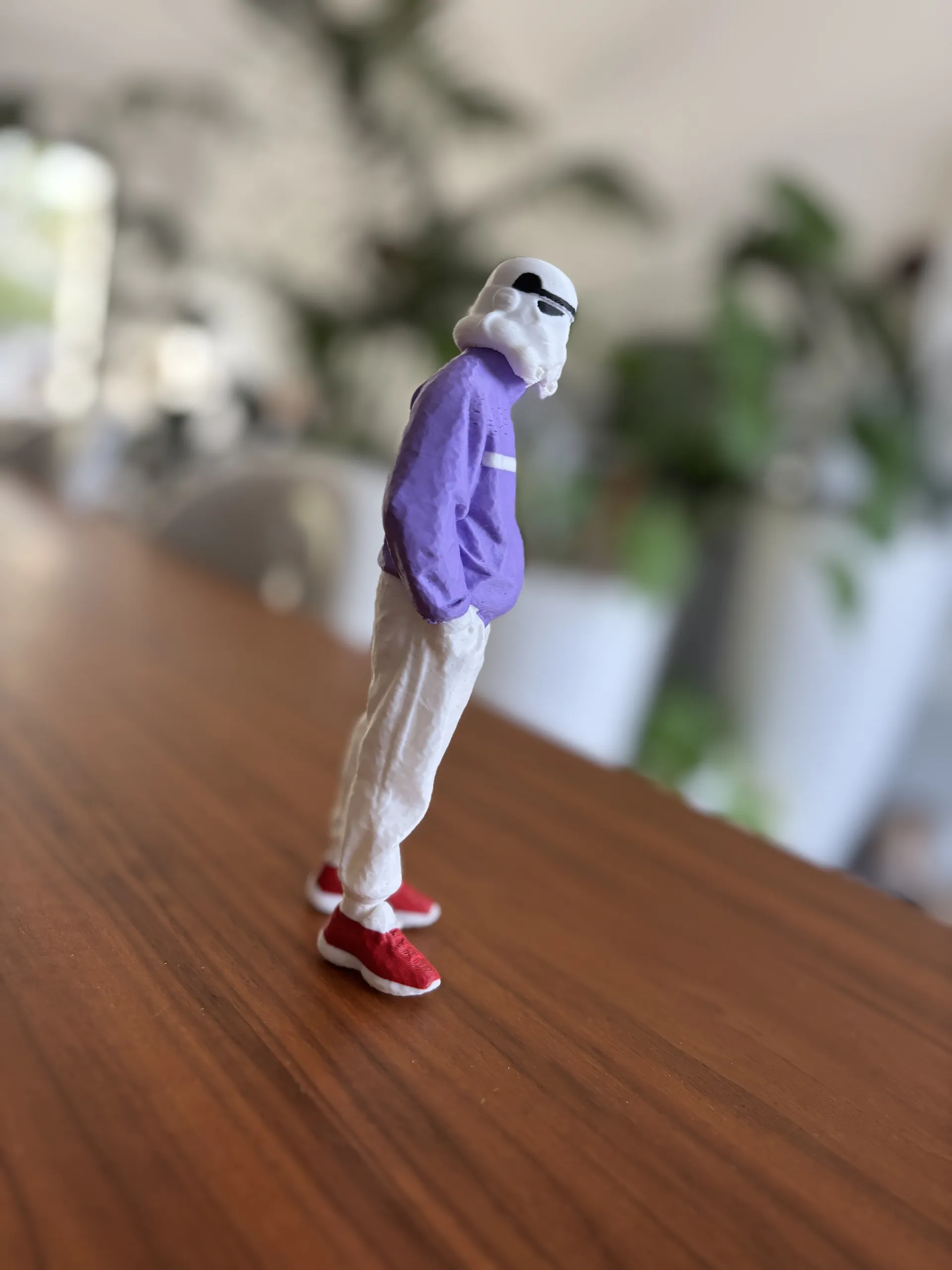 This Stormtrooper just stepped off the Death Star and into the streetwear scene. Sporting a windbreaker-style jacket in violet, crisp white joggers, and standout red sneakers, the look is both bold and effortlessly cool. It’s a stylish spin on Imperial armor—less battle-ready, more brunch-ready.