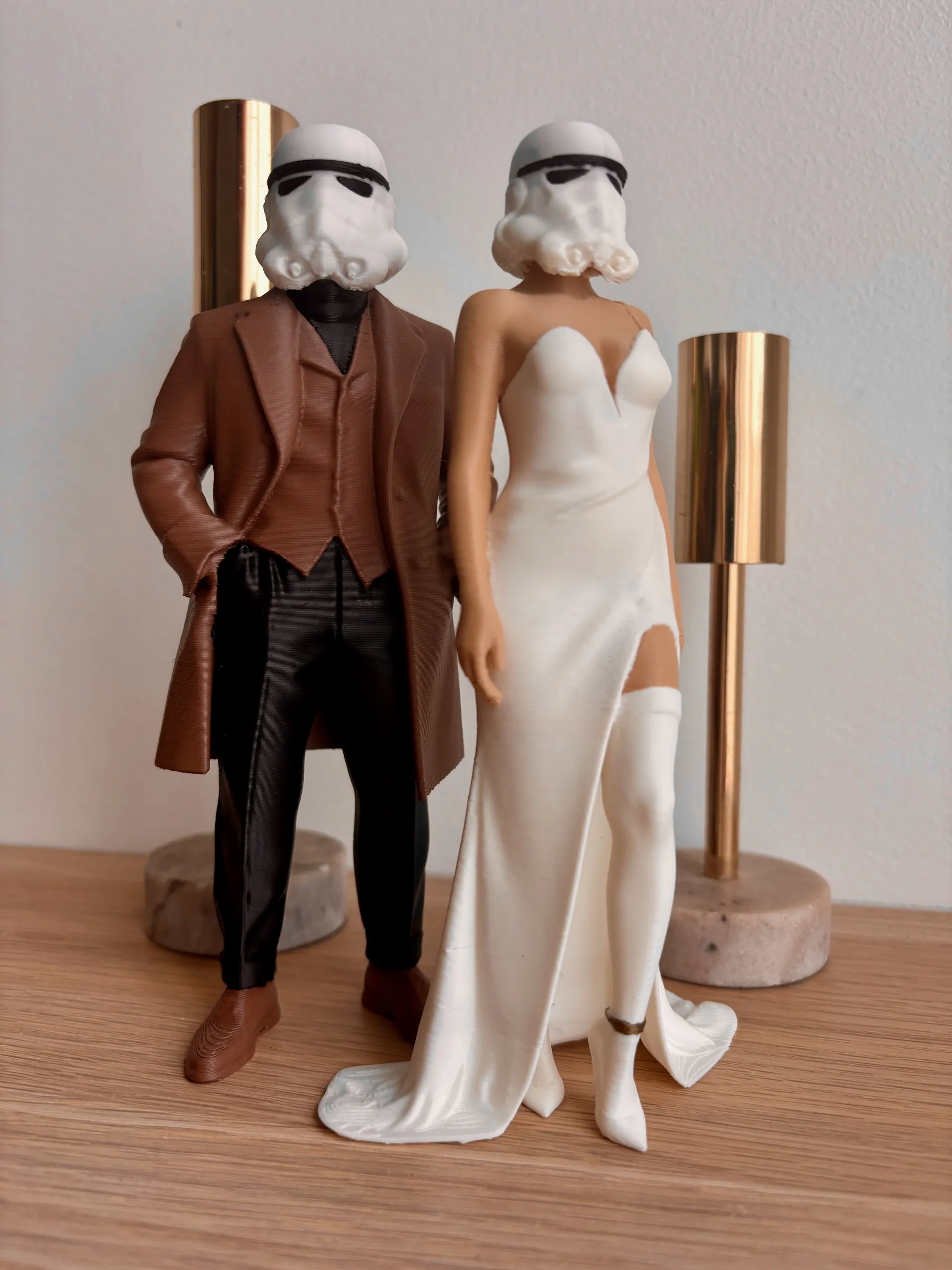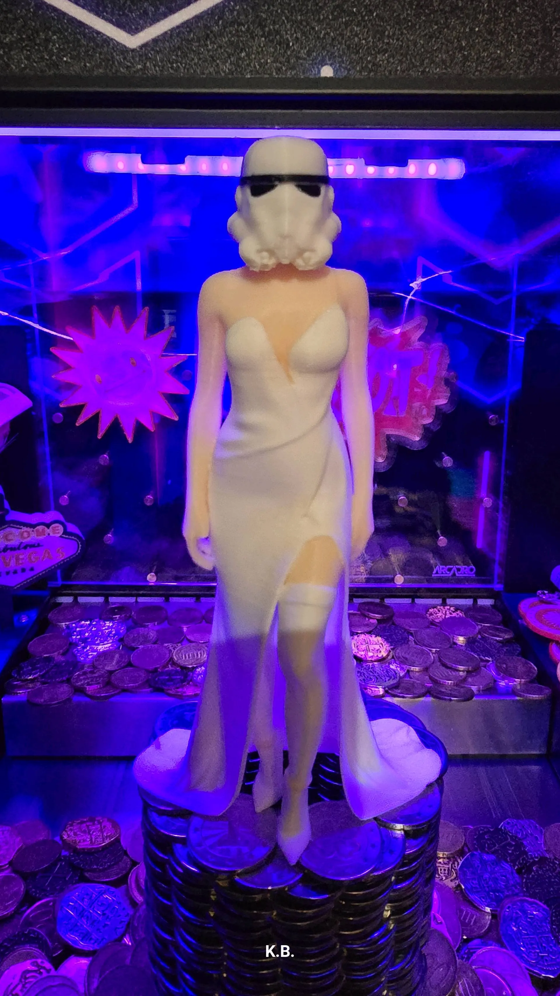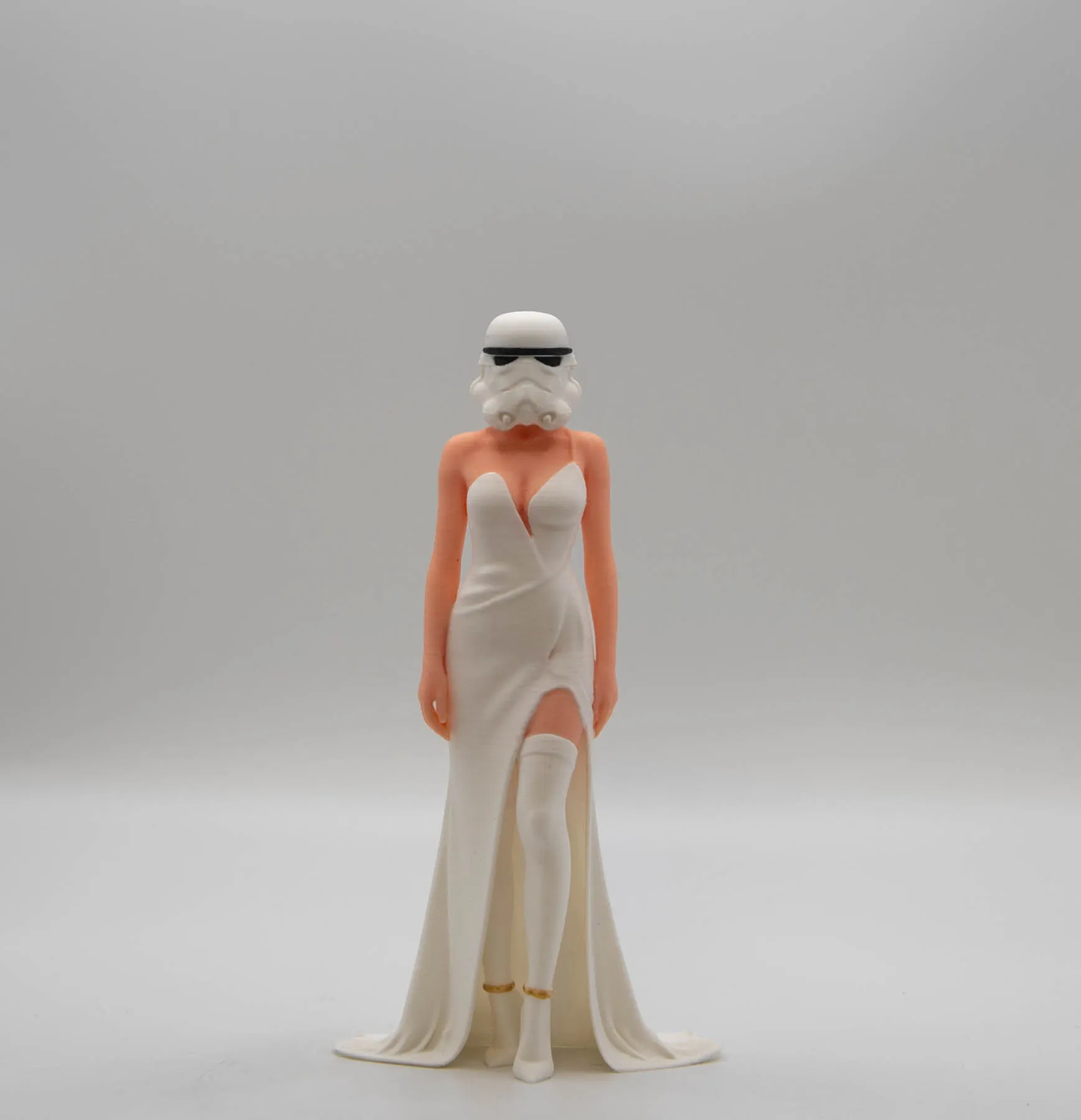 A striking blend of elegance and rebellion, this Stormtrooper channels high fashion in a stunning evening gown. With a sculpted silhouette, thigh-high slit, and confident pose, it’s a reminder that the Force can be fierce and fabulous. Perfect for fans who appreciate a touch of glamour with their galactic lore.